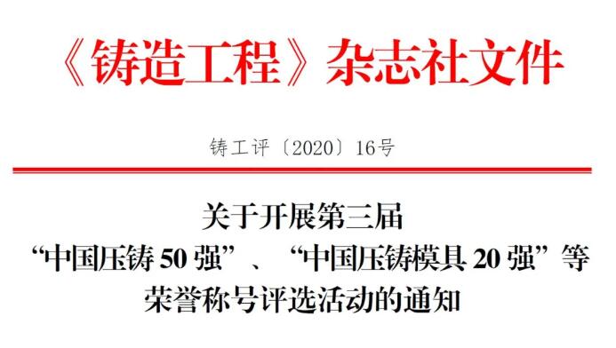 為展示壓鑄行業(yè)近幾年快速發(fā)展所取得的成績,提高優(yōu)秀壓鑄及壓鑄模具企業(yè)品牌影響力,“樹標桿、引路徑”推動壓鑄行業(yè)健康發(fā)展,現正式啟動第三屆“中國壓鑄件生產企業(yè)綜合實力50強(簡稱中國壓鑄50強)”、“中國壓鑄模具生產企業(yè)綜合實力20強(簡稱中國壓鑄模具20強)”及“中國鑄造行業(yè)壓鑄件生產企業(yè)和中國鑄造行業(yè)壓鑄模具生產企業(yè)成長之星”評選活動。請年產值超過1.5億元人民幣的壓鑄件生產企業(yè)和年產值超過5000萬元人民幣的壓鑄模具生產企業(yè)踴躍報名參加。